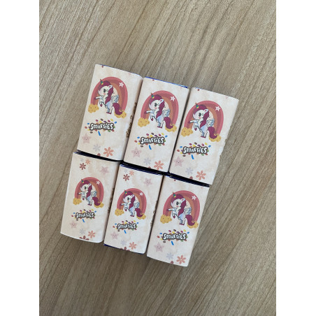 Composition: sucre, lait écrémé en poudre, pâte de cacao, beurre de cacao, farine de blé, matière grasse de lait anhydre, petit lait en poudre, amidon de riz, émulsifiants ( lécithines, colorants rouge de betterave, carotéoïdes, curcumine) concentré de spiruline, agents d'enrobage (cire de carnauba, cire blanche d'abeilles).